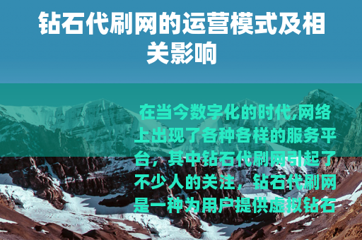 在当今数字化的时代,网络上出现了各种各样的服务平台,其中钻石代刷网引起了不少人的关注,钻石代刷网是一种为用户提供虚拟钻石等虚拟物品代刷服务的网络平台。