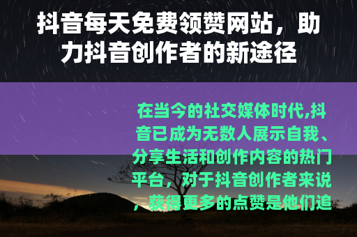 在当今的社交媒体时代,抖音已成为无数人展示自我、分享生活和创作内容的热门平台,对于抖音创作者来说,获得更多的点赞是他们追求的目标之一,因为点赞不仅代表着观众的喜爱和认可,还能帮助作品获得更多的曝光和流量,而抖音每天免费领赞网站的出现,为创作者们提供了一种新的途径来提升自己作品的点赞数。