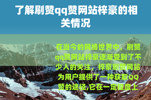 在当今的网络世界中,刷赞qq赞网站梓豪逐渐受到了不少人的关注,梓豪刷赞网站为用户提供了一种获取QQ赞的途径,它在一定程度上满足了部分用户对于社交平台上点赞数量的追求。