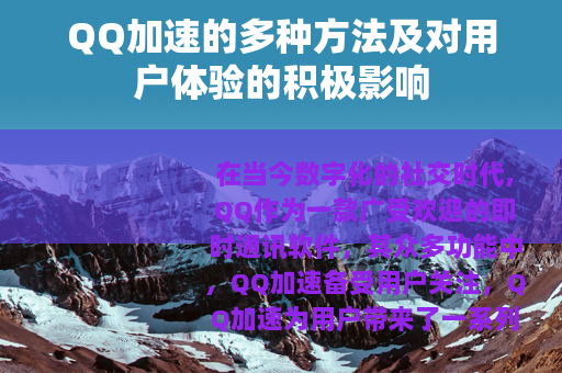 在当今数字化的社交时代,QQ作为一款广受欢迎的即时通讯软件,其众多功能中,QQ加速备受用户关注,QQ加速为用户带来了一系列的好处,丰富了用户的使用体验。