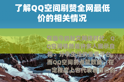 在当今的社交网络时代,QQ空间依然是许多人展示自我、分享生活的重要平台,而QQ空间的点赞数量,在一定程度上也代表着自己的人气和受欢迎程度,不少人都希望能够提高自己QQ空间的点赞数,这也使得QQ空间刷赞服务应运而生,其中全网最低价的刷赞服务更是备受关注。