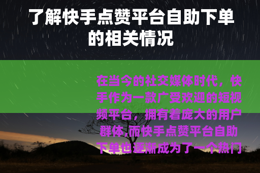 在当今的社交媒体时代,快手作为一款广受欢迎的短视频平台,拥有着庞大的用户群体,而快手点赞平台自助下单也逐渐成为了一个热门话题。