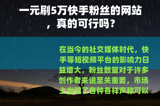 在当今的社交媒体时代,快手等短视频平台的影响力日益增大,粉丝数量对于许多创作者来说至关重要,市场上出现了各种各样声称可以帮助用户快速增加粉丝的服务,其中就包括一些号称一元能刷5万快手粉丝的网站。
