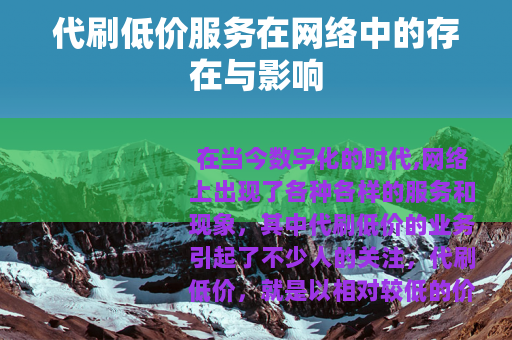 在当今数字化的时代,网络上出现了各种各样的服务和现象,其中代刷低价的业务引起了不少人的关注,代刷低价,就是以相对较低的价格为客户提供各种刷量服务,比如刷粉丝、刷点赞、刷评论等。