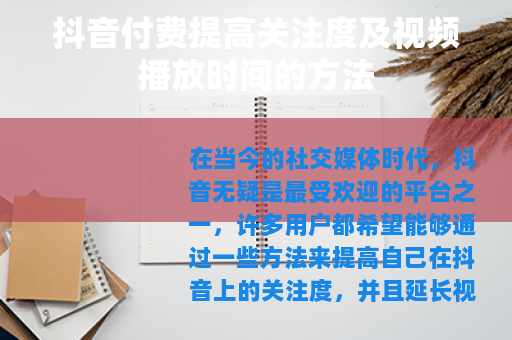 在当今的社交媒体时代,抖音无疑是最受欢迎的平台之一,许多用户都希望能够通过一些方法来提高自己在抖音上的关注度,并且延长视频的播放时间,从而获得更多的流量和曝光,以下是一些关于抖音怎么付费提高关注度及视频播放时间的有效方法。