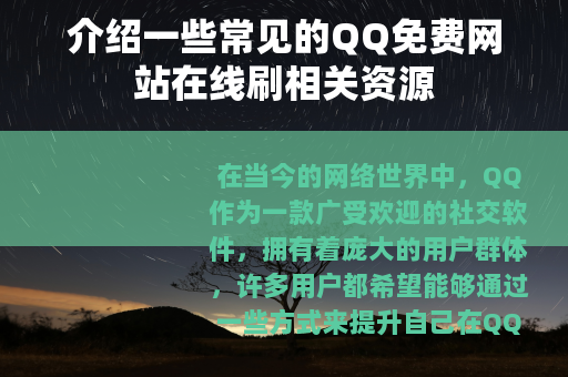 QQ免费网站在线刷虽然在一定程度上满足了部分用户想要快速提升QQ数据的需求,但在使用时需要谨慎权衡利弊,避免因追求表面的数据而忽略了真正的社交价值和个人信息安全,只有通过合法、积极的方式来经营自己的QQ账号,才能在QQ社交中获得真正的满足和成长。 能为你提供一些关于QQ免费网站在线刷的相关信息和思考,让你在面对这一现象时能够做出更加明智的选择。