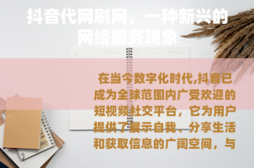 在当今数字化时代,抖音已成为全球范围内广受欢迎的短视频社交平台,它为用户提供了展示自我、分享生活和获取信息的广阔空间,与之相关的一些服务也应运而生,其中抖音代网刷网就是一种较为引人注目的现象。