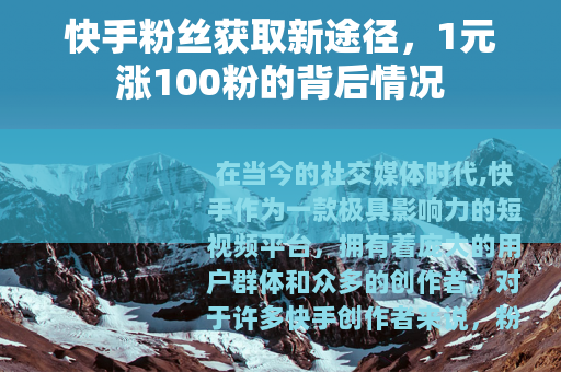 在当今的社交媒体时代,快手作为一款极具影响力的短视频平台,拥有着庞大的用户群体和众多的创作者,对于许多快手创作者来说,粉丝数量是衡量其在平台上影响力和成功与否的一个重要指标,而在这个追求粉丝量的潮流中,出现了一种看似非常诱人的现象,那就是1元涨100个快手粉丝。