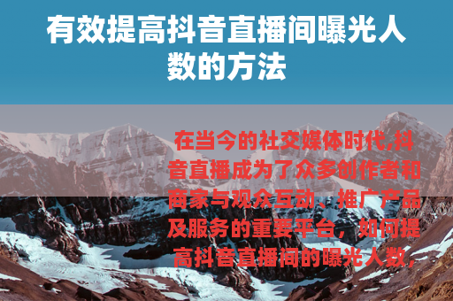 在当今的社交媒体时代,抖音直播成为了众多创作者和商家与观众互动、推广产品及服务的重要平台,如何提高抖音直播间的曝光人数,却是许多人面临的一个挑战,以下是一些切实可行的方法,可以帮助你提升抖音直播间的曝光度,吸引更多的观众进入直播间。