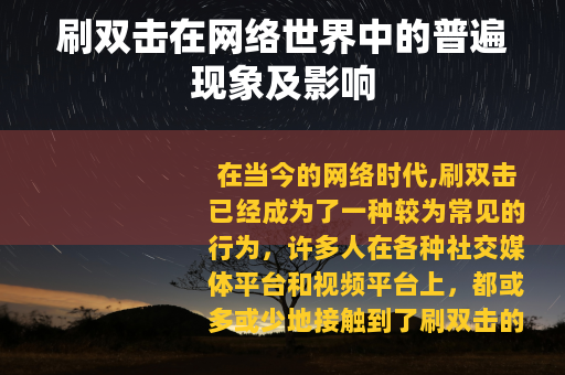 刷双击在网络世界中是一种普遍存在的现象,它既有可能为创作者和平台带来一定的好处,也可能会引发一些问题,我们需要以客观、理性的态度去看待它,充分发挥其积极作用,同时避免其带来的负面影响,共同营造一个健康、有序、充满活力的网络环境。