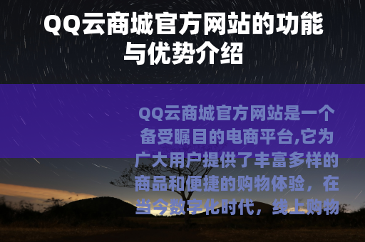 QQ云商城官方网站是一个备受瞩目的电商平台,它为广大用户提供了丰富多样的商品和便捷的购物体验,在当今数字化时代,线上购物已经成为人们生活中不可或缺的一部分,而QQ云商城官方网站则凭借其独特的特点在众多电商平台中脱颖而出。