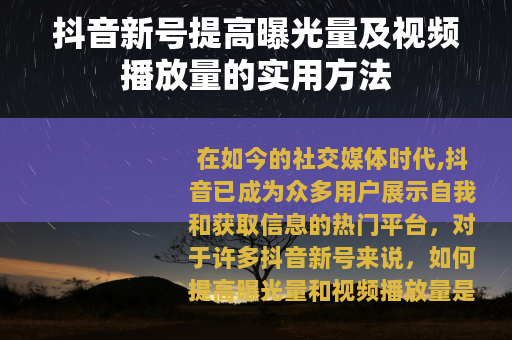 在如今的社交媒体时代,抖音已成为众多用户展示自我和获取信息的热门平台,对于许多抖音新号来说,如何提高曝光量和视频播放量是一个至关重要的问题,以下是一些有效的方法,帮助你的抖音新号获得更多的关注和流量。