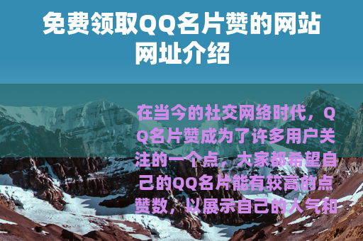 无论是对于年轻的学生群体,还是对于广大的社交爱好者来说,免费领取QQ名片赞的网站网址都有着一定的吸引力和实用价值,它为我们的QQ社交生活增添了一抹别样的色彩,让我们在虚拟的网络世界里能够更加自信地展现自己,与更多的人建立联系和互动,只要我们能够正确对待和使用这些网站,它们就会成为我们社交生活中的有益补充,为我们带来更多的快乐和惊喜。