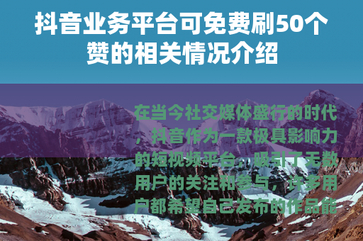 在当今社交媒体盛行的时代,抖音作为一款极具影响力的短视频平台,吸引了无数用户的关注和参与,许多用户都希望自己发布的作品能够获得更多的点赞,以此来增加作品的曝光度和影响力,而在众多关于抖音的话题中,抖音业务平台免费刷50个赞的说法也引起了不少人的兴趣。