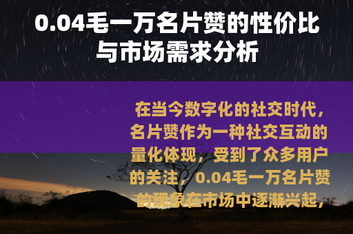 在当今数字化的社交时代,名片赞作为一种社交互动的量化体现,受到了众多用户的关注,0.04毛一万名片赞的现象在市场中逐渐兴起,具有一定的特点和价值。