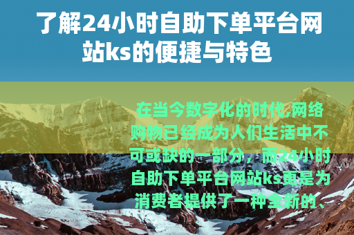 在当今数字化的时代,网络购物已经成为人们生活中不可或缺的一部分,而24小时自助下单平台网站ks更是为消费者提供了一种全新的、便捷的购物体验。