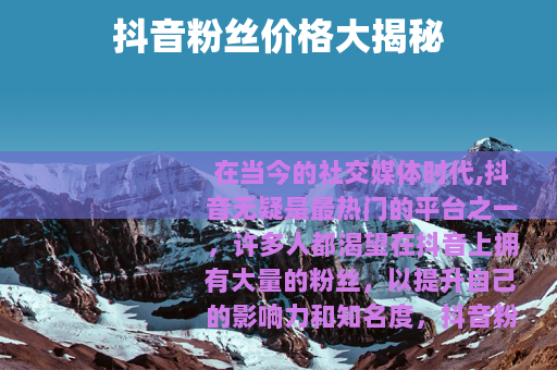 在当今的社交媒体时代,抖音无疑是最热门的平台之一,许多人都渴望在抖音上拥有大量的粉丝,以提升自己的影响力和知名度,抖音粉丝到底多少钱呢?
