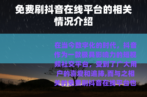 在当今数字化的时代,抖音作为一款极具影响力的短视频社交平台,受到了广大用户的喜爱和追捧,而与之相关的免费刷抖音在线平台也逐渐进入了人们的视野。