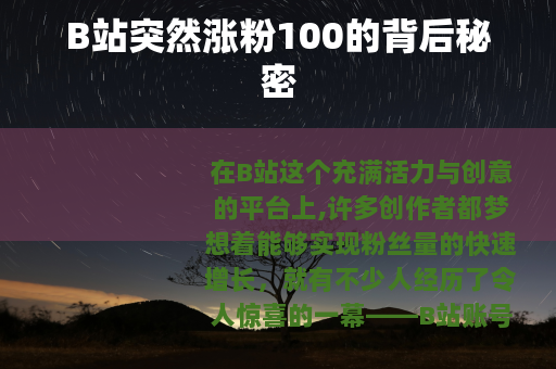 在B站这个充满活力与创意的平台上,许多创作者都梦想着能够实现粉丝量的快速增长,就有不少人经历了令人惊喜的一幕——B站账号突然涨粉100 ,这看似简单的数字增长,背后却有着许多值得探讨的因素。