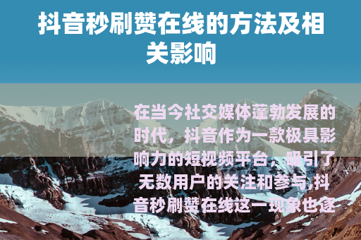 在当今社交媒体蓬勃发展的时代,抖音作为一款极具影响力的短视频平台,吸引了无数用户的关注和参与,抖音秒刷赞在线这一现象也逐渐进入了大众的视野。