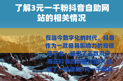 在当今数字化的时代,抖音作为一款极具影响力的短视频平台,吸引了无数用户,而在抖音的发展过程中,出现了一些诸如3元一千粉抖音自助网站这样的现象。