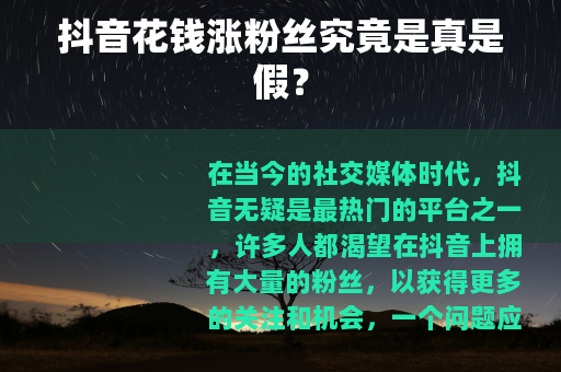 在当今的社交媒体时代,抖音无疑是最热门的平台之一,许多人都渴望在抖音上拥有大量的粉丝,以获得更多的关注和机会,一个问题应运而生:抖音花钱涨粉丝是真的吗?