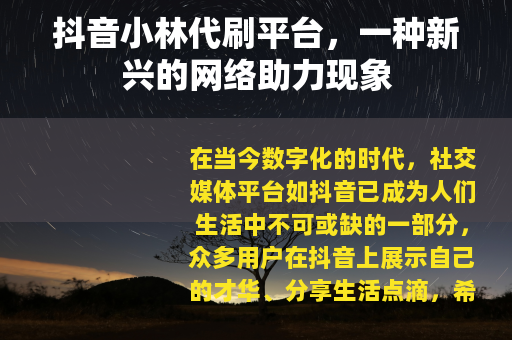 在当今数字化的时代,社交媒体平台如抖音已成为人们生活中不可或缺的一部分,众多用户在抖音上展示自己的才华、分享生活点滴,希望能获得更多的关注和点赞,而在这个过程中,抖音小林代刷平台应运而生,为一些用户提供了一种别样的助力方式。