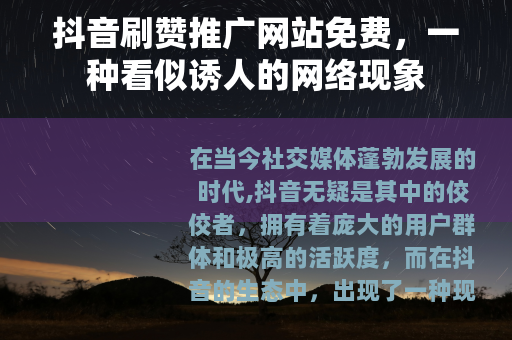 在当今社交媒体蓬勃发展的时代,抖音无疑是其中的佼佼者,拥有着庞大的用户群体和极高的活跃度,而在抖音的生态中,出现了一种现象,那就是抖音刷赞推广网站免费的存在。