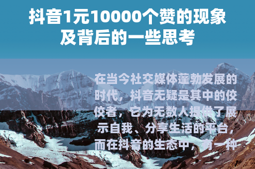 在当今社交媒体蓬勃发展的时代,抖音无疑是其中的佼佼者,它为无数人提供了展示自我、分享生活的平台,而在抖音的生态中,有一种现象引起了广泛的关注,那就是所谓的“抖音1元10000个赞”。