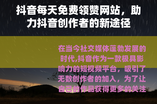 在当今社交媒体蓬勃发展的时代,抖音作为一款极具影响力的短视频平台,吸引了无数创作者的加入,为了让自己的作品获得更多的关注和认可,点赞数成为了一个重要的衡量指标,而抖音每天免费领赞网站的出现,为创作者们提供了一个额外的助力渠道。