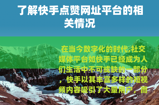 快手点赞网址平台作为快手生态系统中的一个重要组成部分,在促进短视频创作和传播、丰富用户体验、推动行业发展等方面都发挥着积极的作用,只要用户能够正确认识和合理使用这些平台,它们将为用户带来更多的价值和机会,助力用户在快手平台上实现自己的梦想和目标,共同创造一个更加繁荣、多元的短视频世界。 您能满意,若您还有其他想法或修改意见,请随时告诉我,需要注意的是,使用非官方正规渠道的刷赞等行为可能存在违反平台规定的风险,具体情况需根据平台政策和法律法规来判断和处理 ,以上文章仅为基于给定要求的创作内容,不构成任何实际行为的指导或建议。
