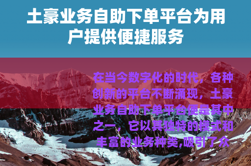 在当今数字化的时代,各种创新的平台不断涌现,土豪业务自助下单平台便是其中之一,它以其独特的模式和丰富的业务种类,吸引了众多用户的关注。