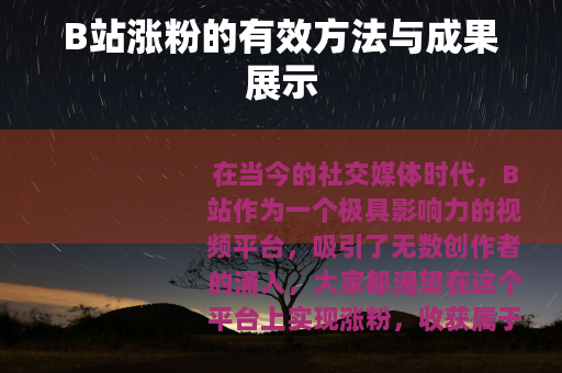 通过以上这些方法的持续实践和努力,许多创作者都在B站取得了显著的涨粉成果,他们的粉丝数量不断攀升,视频的播放量和点赞数也屡创新高,成为了B站上备受瞩目的创作者,这些成功的案例为更多的人提供了借鉴和激励,让大家相信只要坚持不懈地努力,就能够在B站实现自己的涨粉目标,收获属于自己的成果与荣耀。