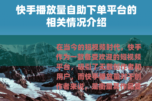 在当今的短视频时代,快手作为一款备受欢迎的短视频平台,吸引了无数创作者和用户,而快手播放量对于创作者来说,是衡量其作品受欢迎程度的一个重要指标,快手播放量自助下单平台应运而生。