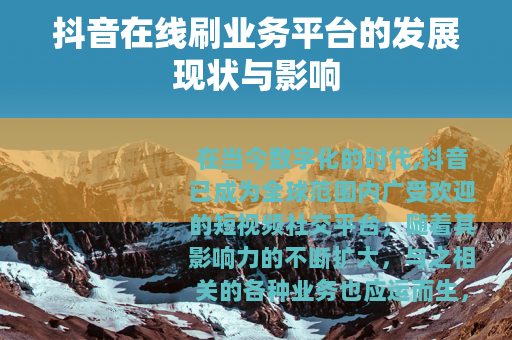 在当今数字化的时代,抖音已成为全球范围内广受欢迎的短视频社交平台,随着其影响力的不断扩大,与之相关的各种业务也应运而生,其中抖音在线刷业务平台就是一个备受关注的领域。