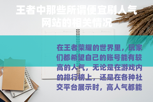 在王者荣耀的世界里,玩家们都希望自己的账号能有较高的人气,无论是在游戏内的排行榜上,还是在各种社交平台展示时,高人气都能带来一定的满足感和成就感,一些声称能提供最便宜刷人气服务的网站便应运而生。