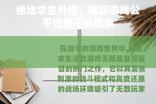在当今的游戏世界中,绝地求生这款游戏无疑是备受瞩目的热门之作,它以其紧张刺激的战斗模式和高度还原的战场环境吸引了无数玩家的参与,伴随着游戏的火爆,一个令人头疼的问题也逐渐凸显出来,那就是绝地求生外挂的存在。