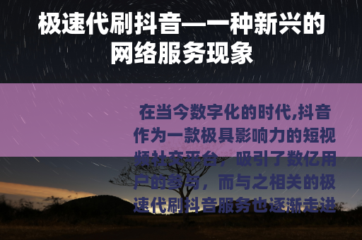 在当今数字化的时代,抖音作为一款极具影响力的短视频社交平台,吸引了数亿用户的参与,而与之相关的极速代刷抖音服务也逐渐走进了人们的视野。