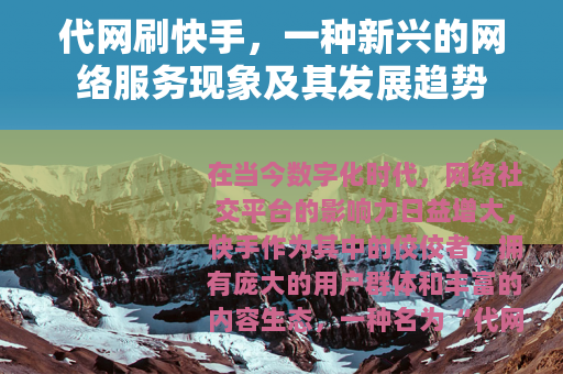 在当今数字化时代,网络社交平台的影响力日益增大,快手作为其中的佼佼者,拥有庞大的用户群体和丰富的内容生态,一种名为“代网刷快手”的服务也悄然兴起,成为了网络世界中一个备受关注的现象。