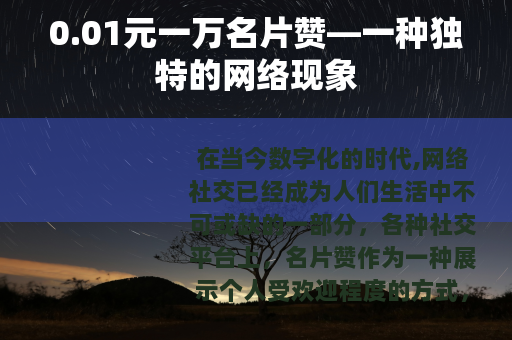 在当今数字化的时代,网络社交已经成为人们生活中不可或缺的一部分,各种社交平台上,名片赞作为一种展示个人受欢迎程度的方式,受到了众多用户的关注,而其中,0.01元一万名片赞的现象更是引起了不少人的兴趣。