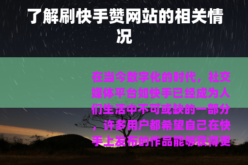 在当今数字化的时代,社交媒体平台如快手已经成为人们生活中不可或缺的一部分,许多用户都希望自己在快手上发布的作品能够获得更多的点赞,从而获得更多的关注和认可,在这样的需求下,刷快手赞网站应运而生。