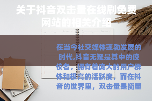 在当今社交媒体蓬勃发展的时代,抖音无疑是其中的佼佼者,拥有着庞大的用户群体和极高的活跃度,而在抖音的世界里,双击量是衡量一个视频受欢迎程度的重要指标之一,抖音双击量在线刷免费网站便应运而生,吸引了众多用户的关注。