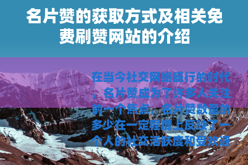 在当今社交网络盛行的时代,名片赞成为了许多人关注的一个焦点,名片赞数量的多少在一定程度上反映了一个人的社交活跃度和受欢迎程度,对于很多人来说,拥有较高的名片赞数量可以带来一种满足感和成就感,不少人都在寻找各种方法来增加自己的名片赞数量,而免费刷1000名片赞网站也应运而生。