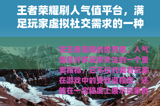 在王者荣耀的世界里,人气值是许多玩家关注的一个重要指标,它不仅代表着玩家在游戏中的受欢迎程度,还能在一定程度上展示玩家的游戏实力和社交影响力,而王者荣耀刷人气值平台,也就在这样的背景下应运而生,为玩家提供了一种快速提升人气值的途径。