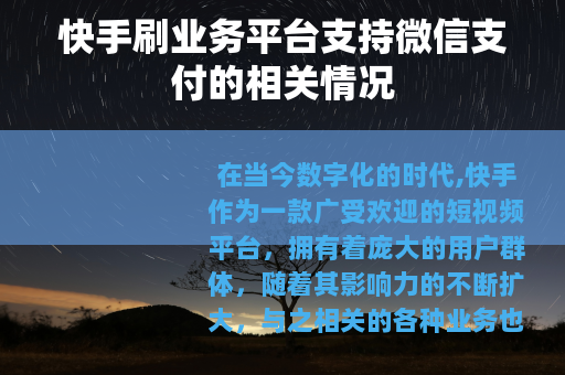 在当今数字化的时代,快手作为一款广受欢迎的短视频平台,拥有着庞大的用户群体,随着其影响力的不断扩大,与之相关的各种业务也日益丰富起来,快手刷业务平台逐渐进入了人们的视野,并且一些平台还支持微信支付这一便捷的支付方式。
