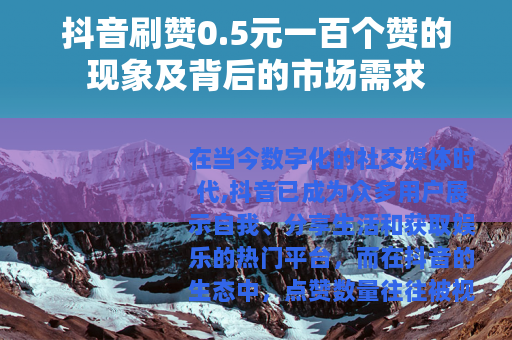 在当今数字化的社交媒体时代,抖音已成为众多用户展示自我、分享生活和获取娱乐的热门平台,而在抖音的生态中,点赞数量往往被视为衡量一个视频受欢迎程度的重要指标之一,一种“抖音刷赞0.5元一百个赞”的服务悄然兴起,引发了广泛的关注和讨论。