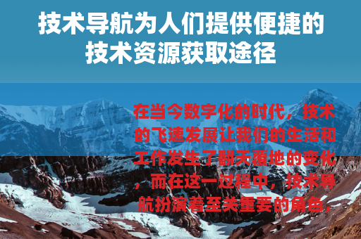 在当今数字化的时代,技术的飞速发展让我们的生活和工作发生了翻天覆地的变化,而在这一过程中,技术导航扮演着至关重要的角色,它如同一位贴心的向导,引领着我们在浩瀚的技术海洋中畅游,帮助我们快速找到所需的技术资源,从而提高我们的效率,拓展我们的视野,为我们的创新和发展提供有力的支持。