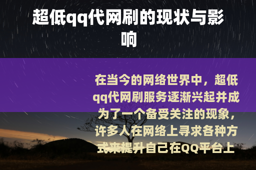 在当今的网络世界中,超低qq代网刷服务逐渐兴起并成为了一个备受关注的现象,许多人在网络上寻求各种方式来提升自己在QQ平台上的相关数据,而超低qq代网刷业务便应运而生,为他们提供了一种看似便捷的途径。