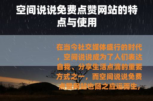 在当今社交媒体盛行的时代,空间说说成为了人们表达自我、分享生活点滴的重要方式之一,而空间说说免费点赞网站也随之应运而生,为众多用户提供了一种增加说说热度和关注度的途径。