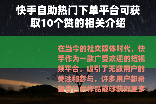 在当今的社交媒体时代,快手作为一款广受欢迎的短视频平台,吸引了无数用户的关注和参与,许多用户都希望自己的作品能够获得更多的点赞,从而提高作品的热度和影响力,而快手自助热门下单平台的出现,为一些用户提供了一种获取点赞的途径,其中就包括可以下单获得10个赞的服务。